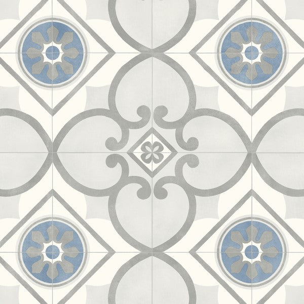 This gorgeous tile style vinyl has a rich design with a white background and grey and blue icons that looks stunning with a wide range of room styles and colours. With a 16.6cm x 16.6cm tile pattern and matt finish, this vinyl has a beautiful realistic appearance that is complemented by a comfy R11 slip resistance rating and an easy to clean surface.