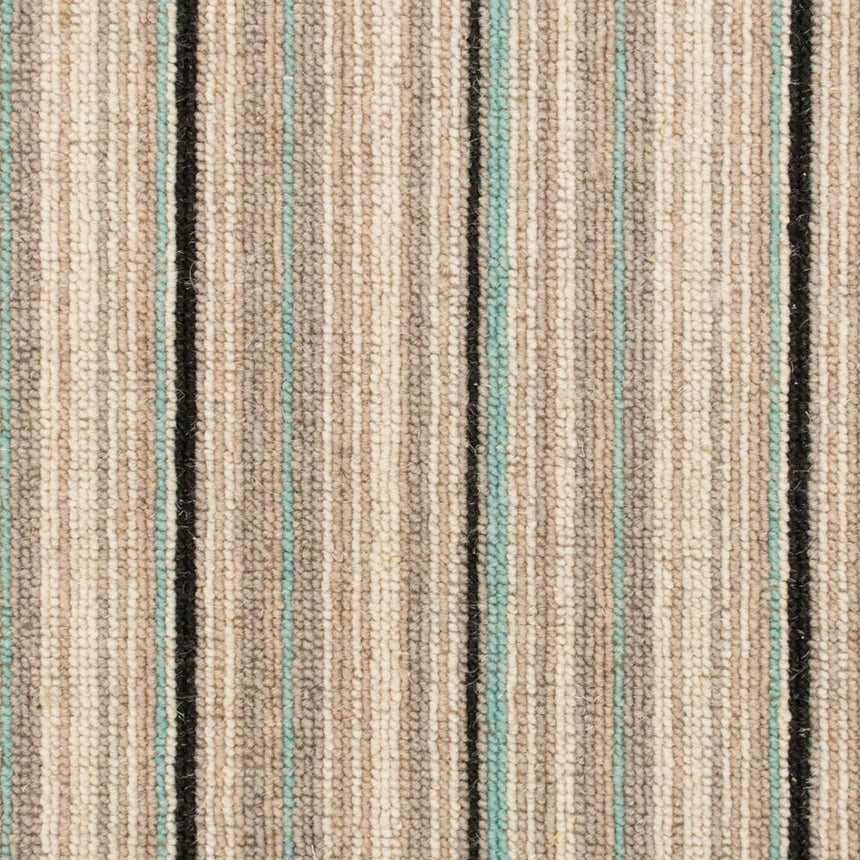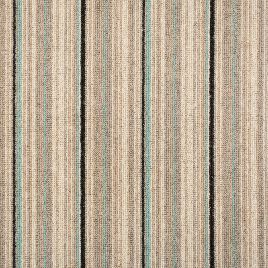 The Aqua Shetland Striped Carpet has a sky blue accent colour with soft beige and black stripes.