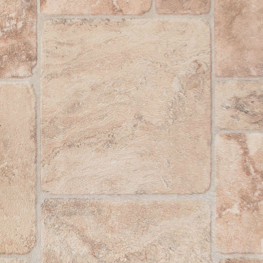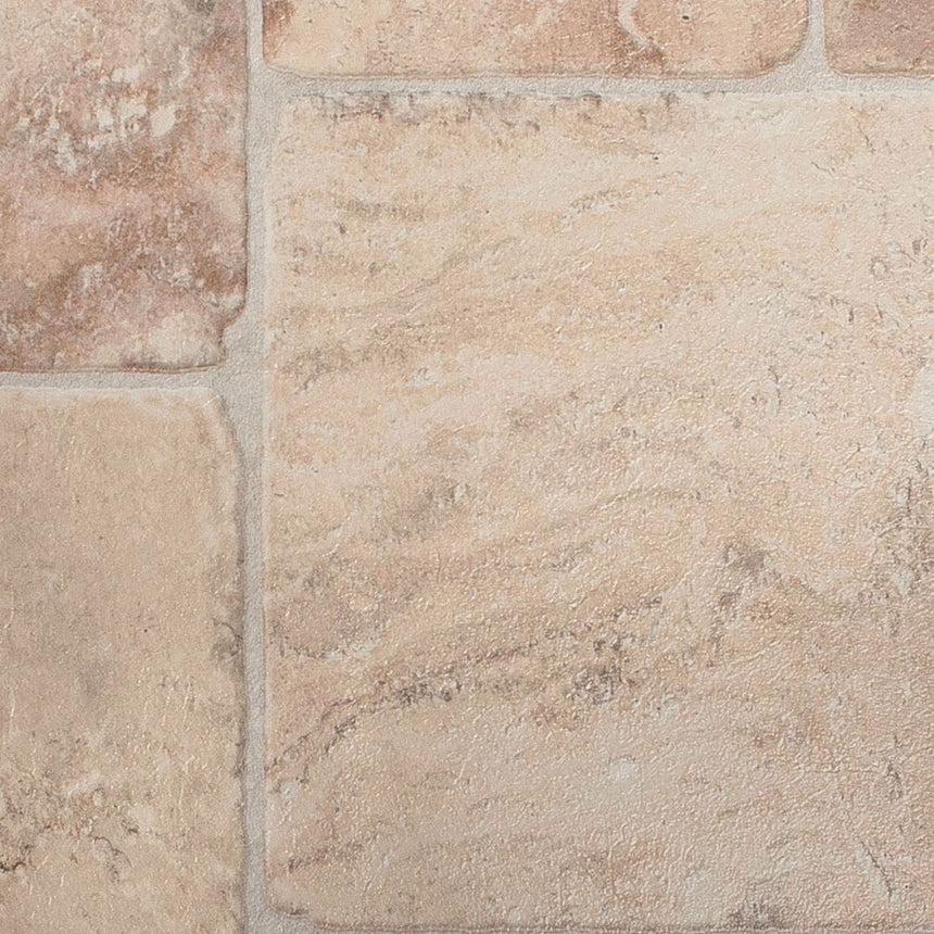 The Babylon 32 Limestone Vinyl Flooring has a mixed tile size in a mosaic style, with a soft beige colouring.