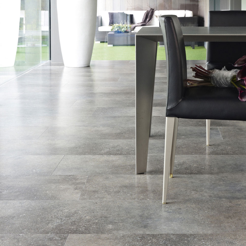 The Belgian Blue Flamed Pure Stone Laminate Flooring has a subtle colouring with a blend of soft browns and blue-greys in a realistic design.