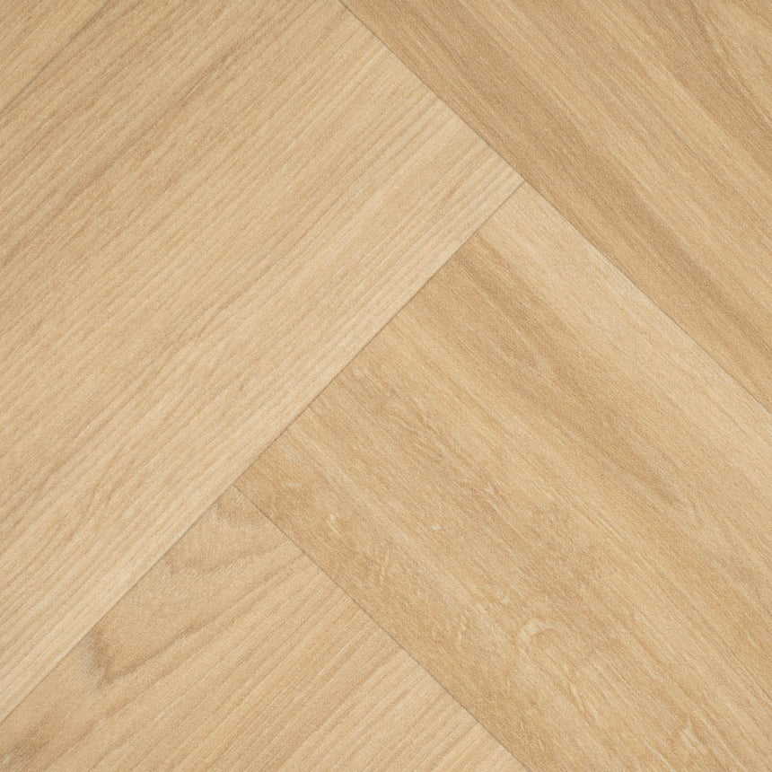 The brilliantly realistic herringbone design transforms your room with its realistic wood pattern, matt finish and natural shading. Warm beige tones provide this vinyl with a beautiful and versatile hue that works with many different styles. Its 14cm x 70cm parquet plank pattern creates a fantastic lifelike look.