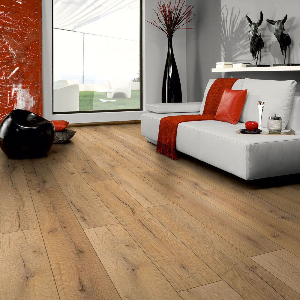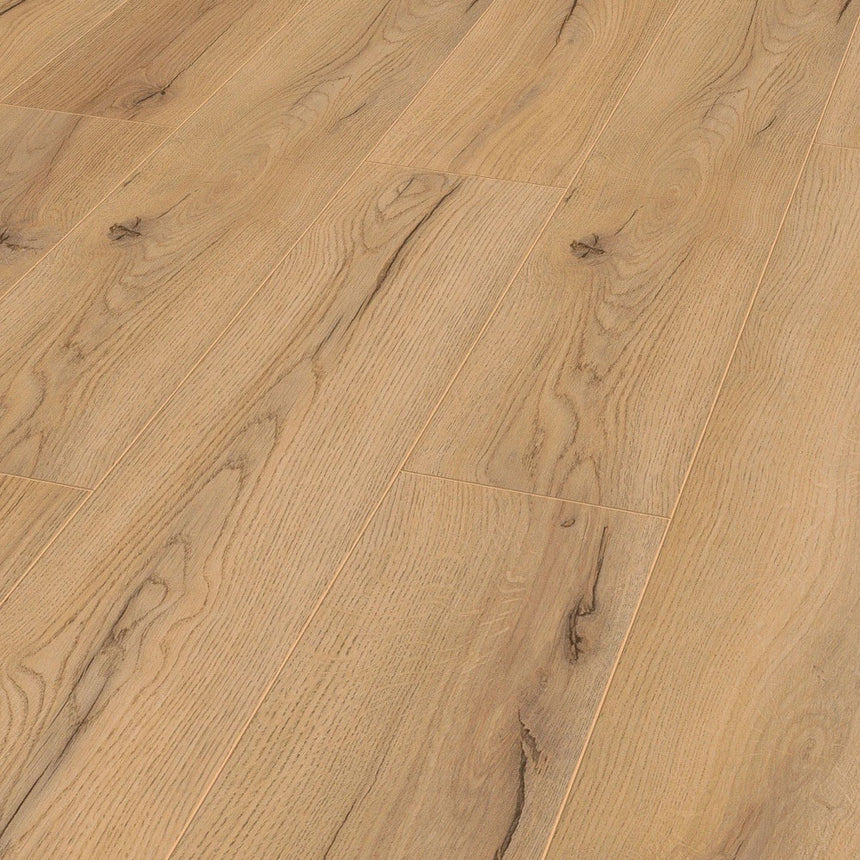 This Swiss Krono laminate is designed for the modern home. It has a heavy domestic rating so you can be assured it'll stand up to traffic in the busy areas of your home. This colour is a creamy beige with a rich, dark brown wood grain pattern.