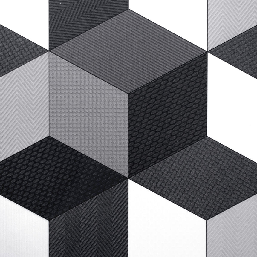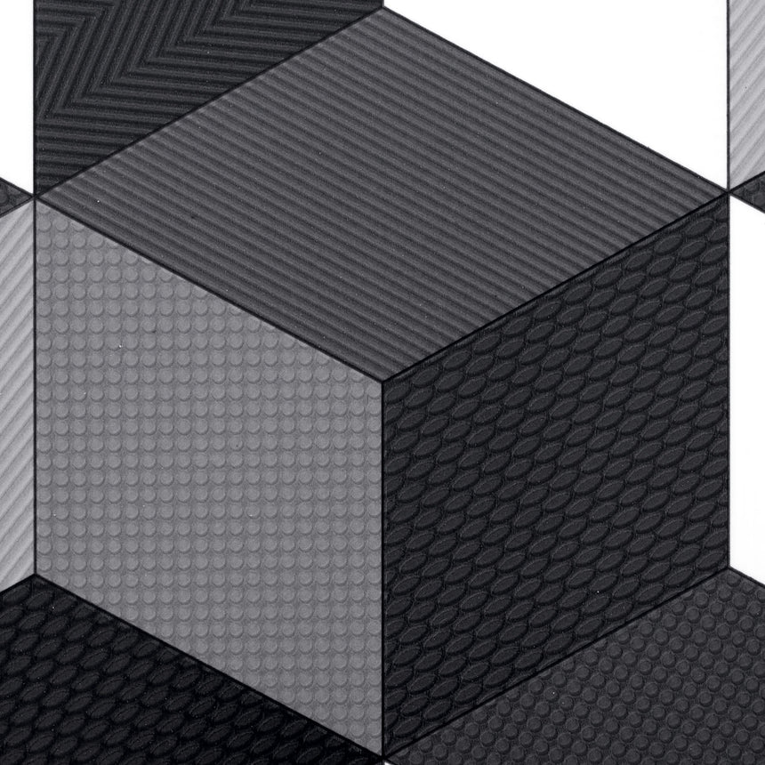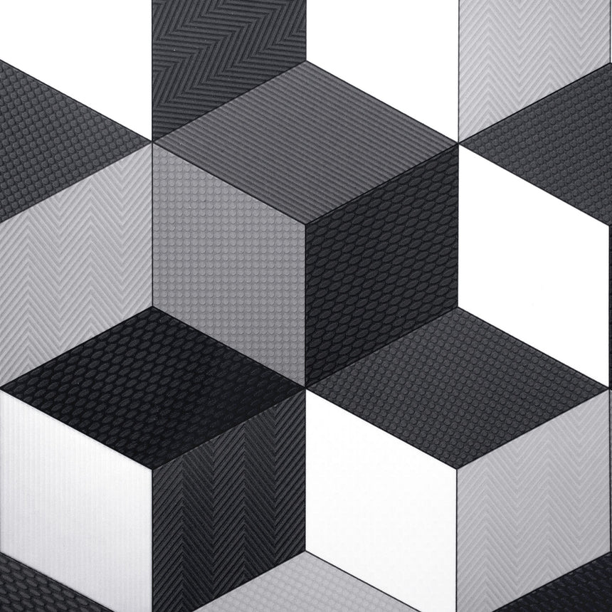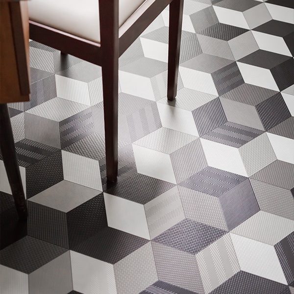 Add an interesting look and feel into any room in your house with this R10 slip resistant rated vinyl. The texture is matched to the design, so each diamond that makes up the design has a different textured effect from lines to small dot or waves. With black, grey and white diamonds that combine to make up the cubes, this vinyl can fit in most style and colours.
