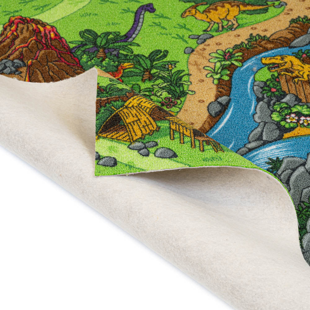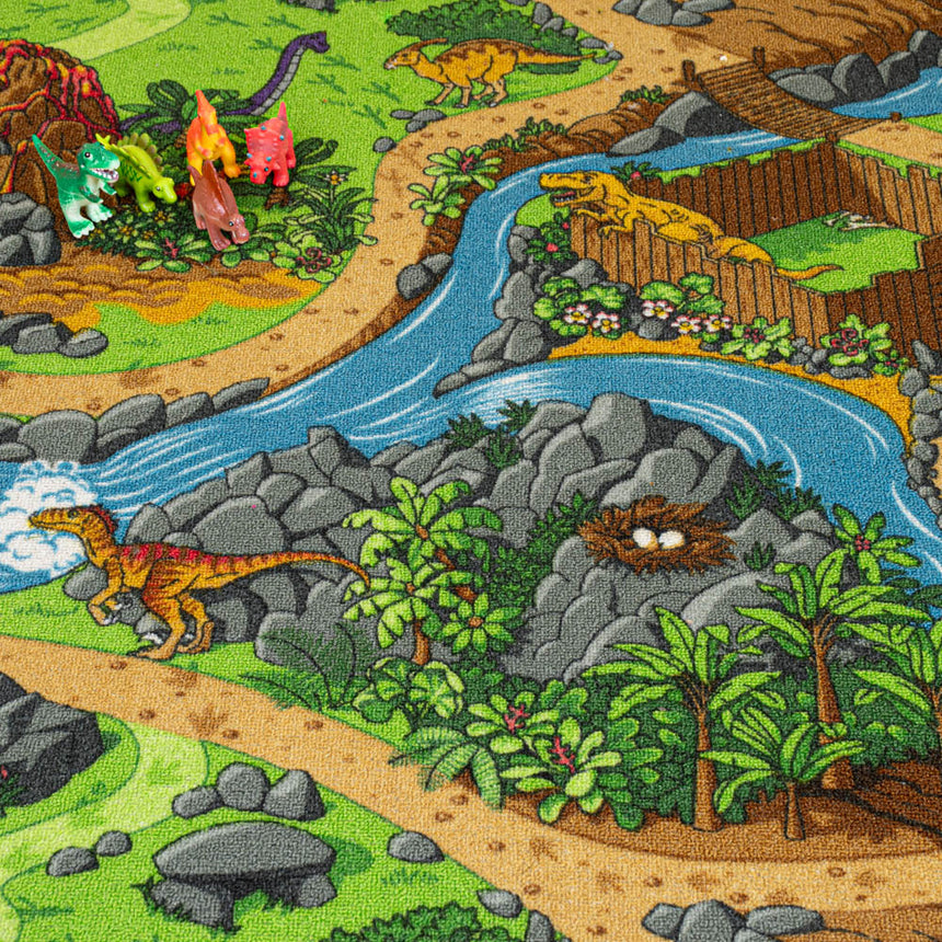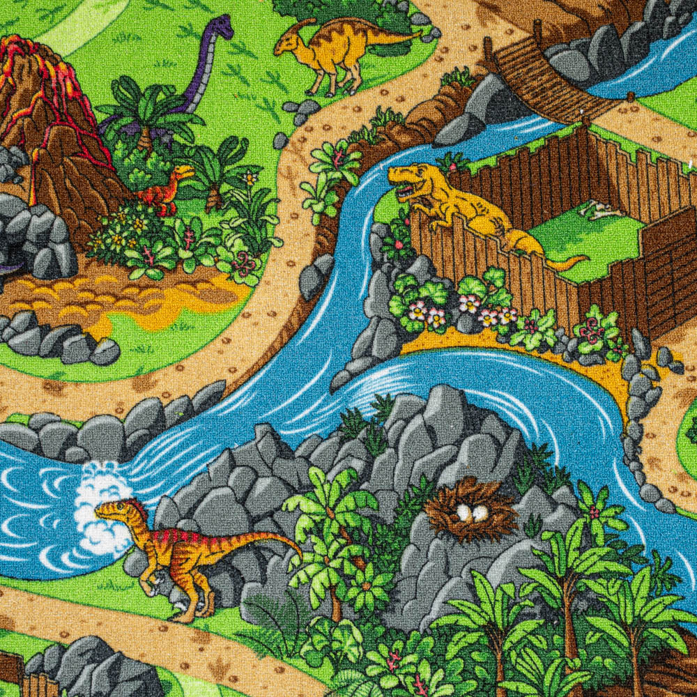 Explore your own dinosaur park with paths, rivers, huts and of course dinosaurs in this spectacular design. With its neat and durable loop pile, this carpet is a great option for many rooms.