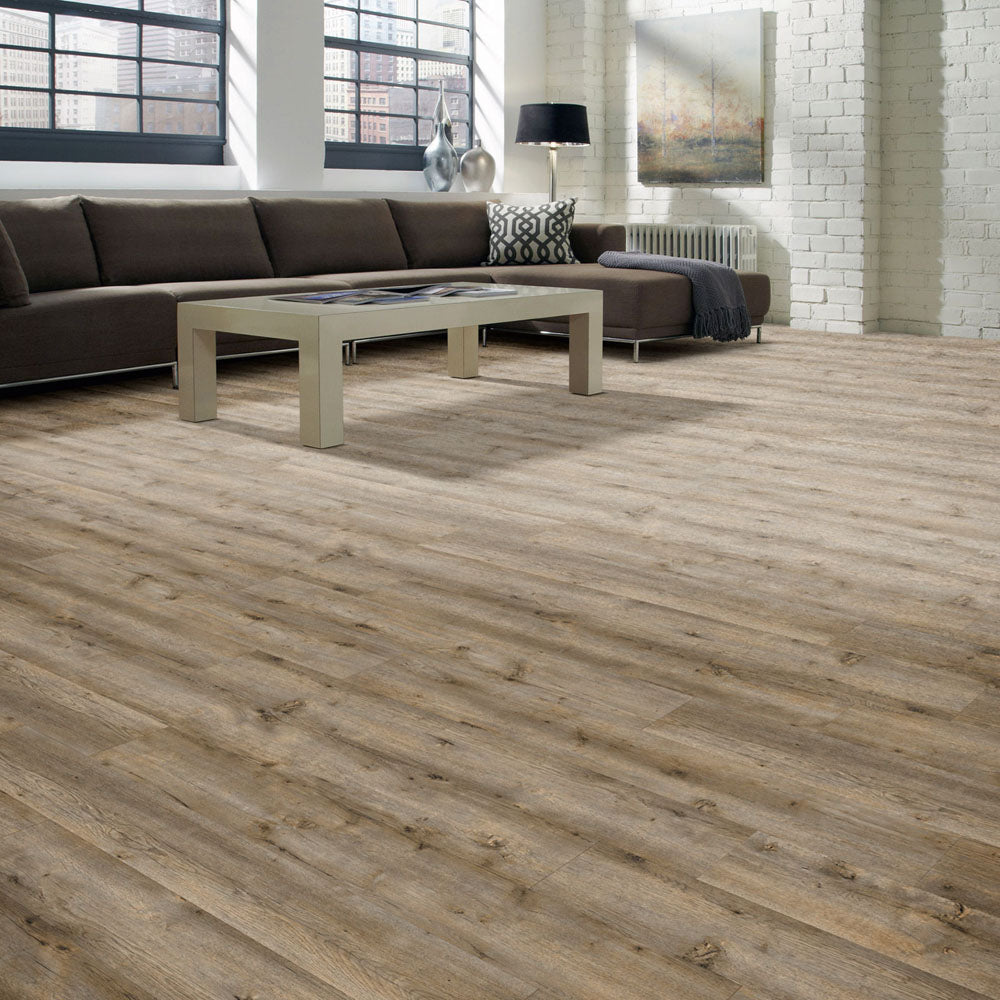 The surface texture is a realistic wood grain feel, wehich follows the grain of the design below it. The surface texture is created by the wear layer, which is resistant to impacts from furniture, castor wheels, and even high heels.