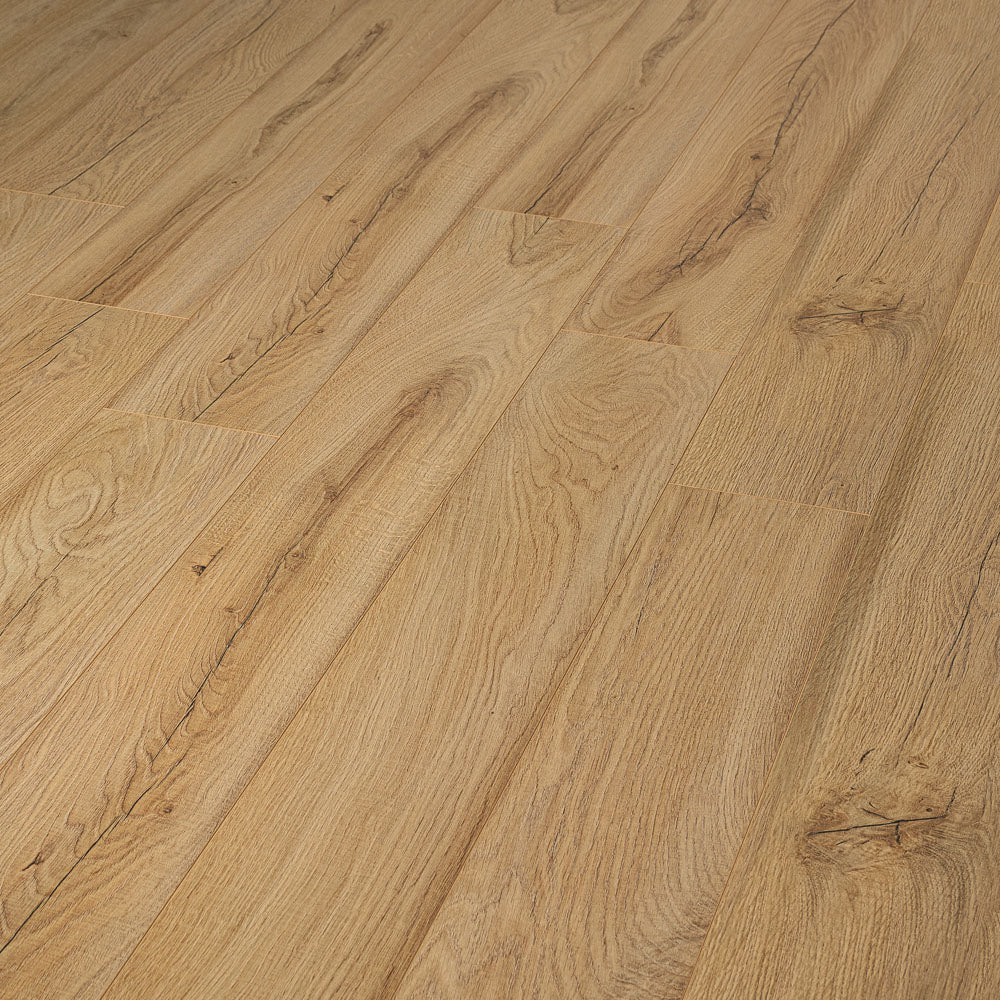 This Farm Oak Kronotex Robusto Villa 12mm Laminate Flooring has a warm and cosy natural hue that gives your floor a traditional appearance. Its realistic wood effect adds an aged effect to the planks to create a country style.