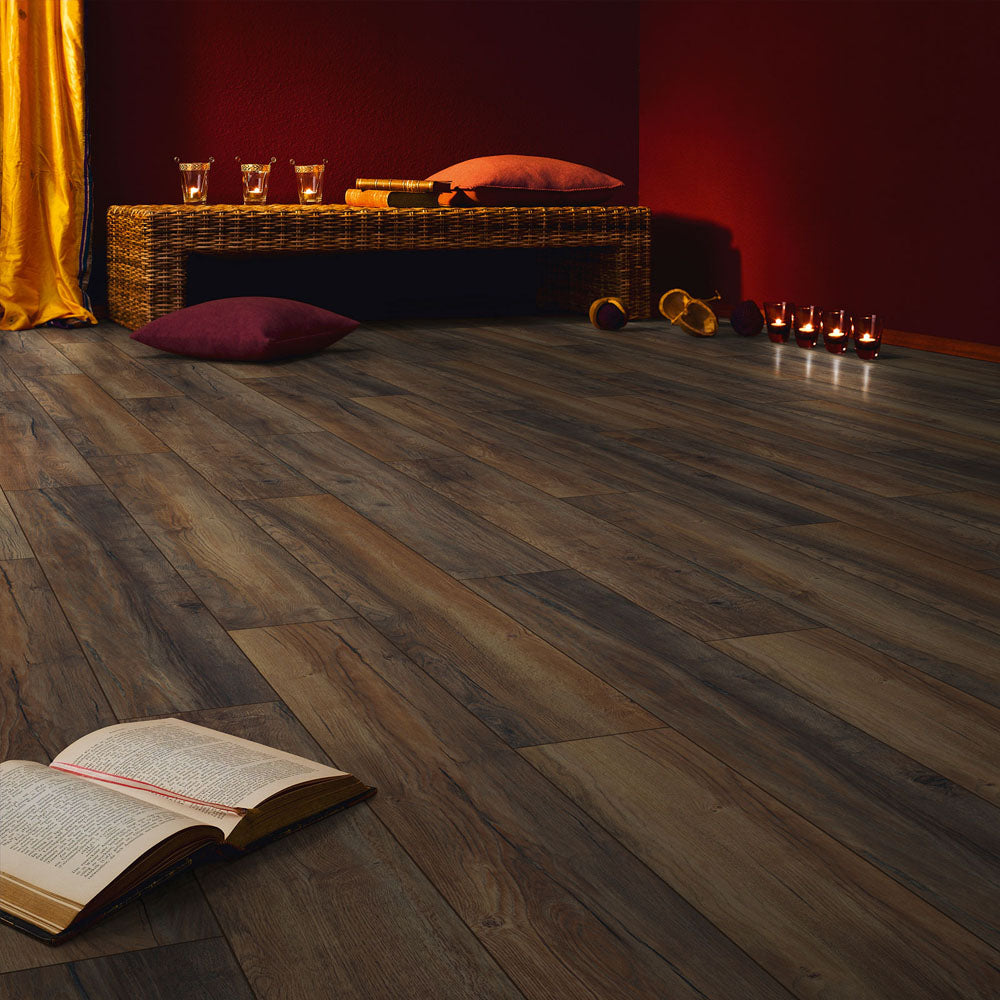 The Harbour Oak Kronotex Robusto Villa 12mm Laminate Flooring has a rich brown colouring with warm golden hues and a rustic design.