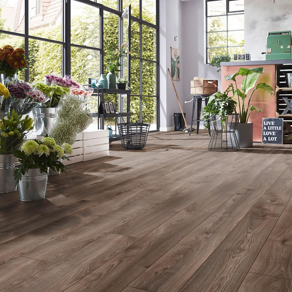 To add a more natural effect this laminate has an elegant mix of browns and grey and features an embossed surface that gives it a textured feel to complement its grain pattern. Its versatile natural tones are combined to give it an even more lifelike look that suits many room styles. for a finish touch the planks on this laminate range come with bevelling that creates a v-groove in the join.