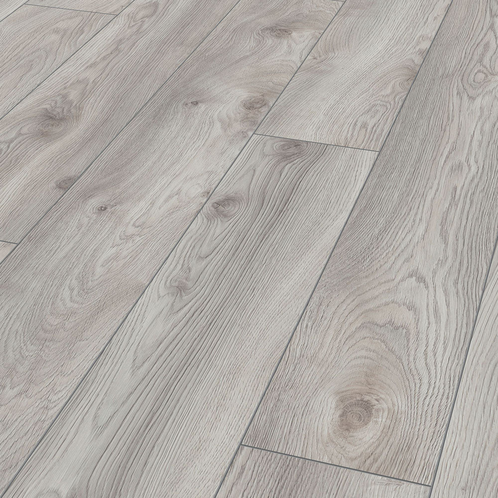 The Macro Oak White Kronotex Mammut 12mm Laminate Flooring has a pale grey colouring with a subtle mix of soft greys in the natural wood grain pattern.