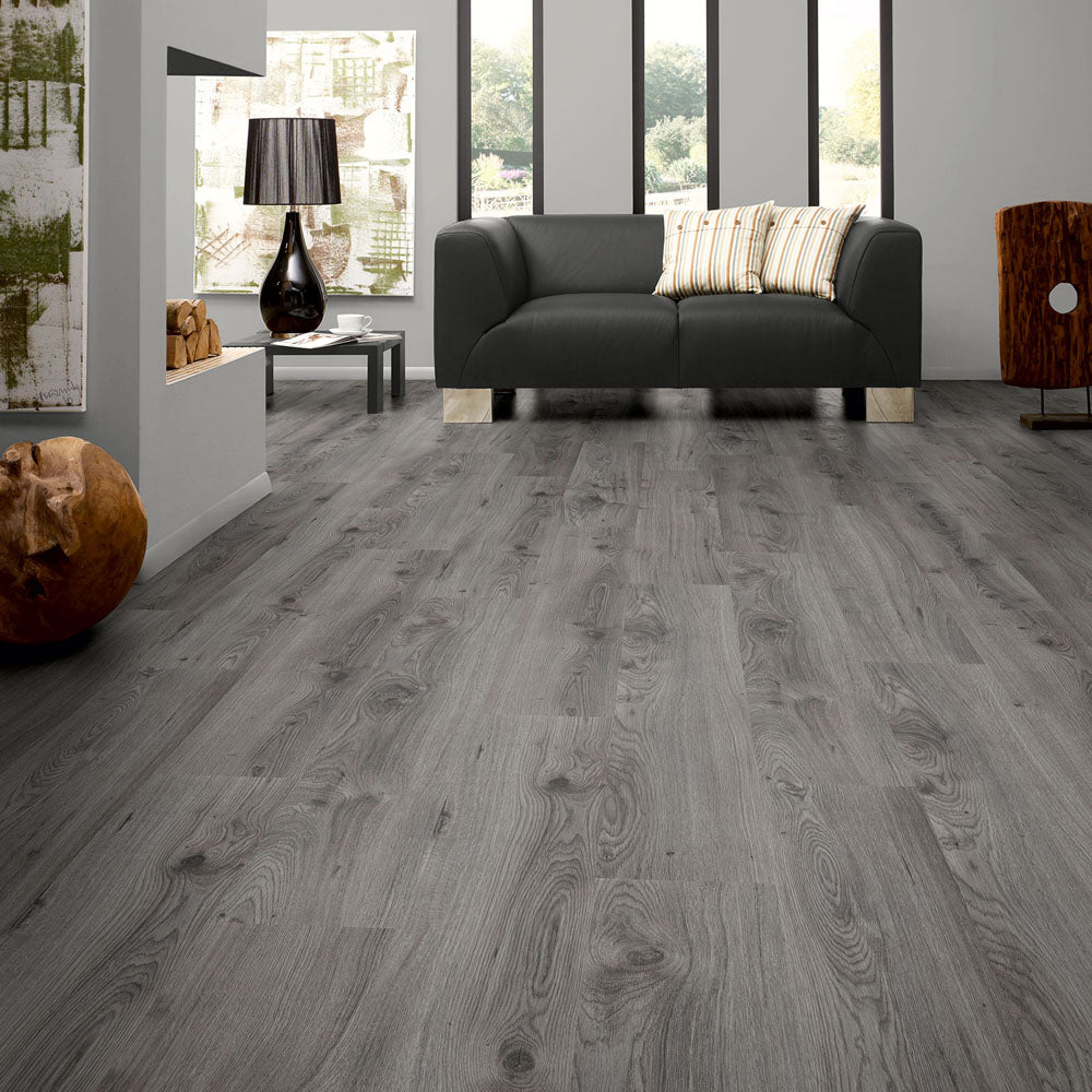 The Mill Oak Grey Standard Laminate Flooring has a rich grey colouring with a dark grey wood grain design.
