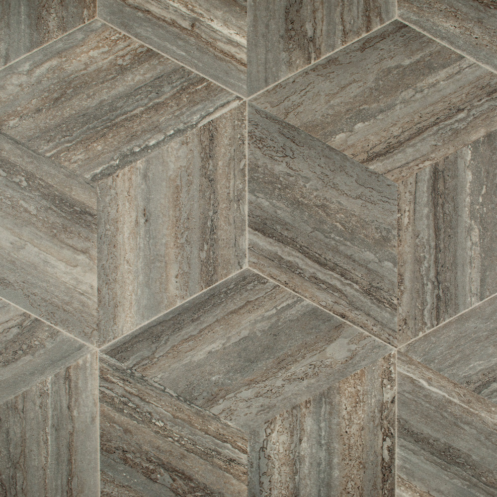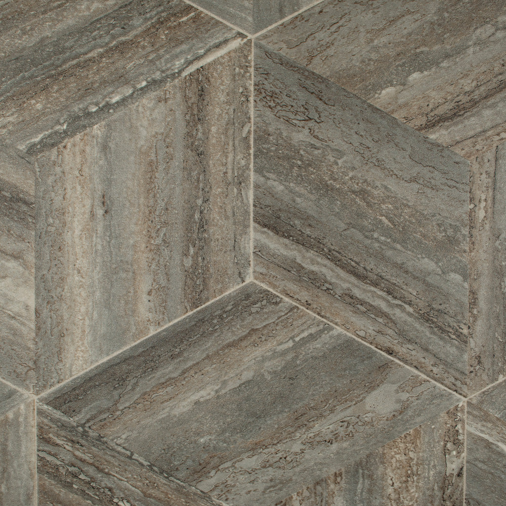 This geometric style vinyl flooring uses 30cm x 33cm stone style tiles to create a hexagonal or 3D cube pattern. The realistic stone effect includes a matt finish, detailed layer design and a variety of brown and grey tones. This Motif T87 combines a natural and contemporary appearance and is the perfect addition for kitchens, bathrooms, living rooms and more.