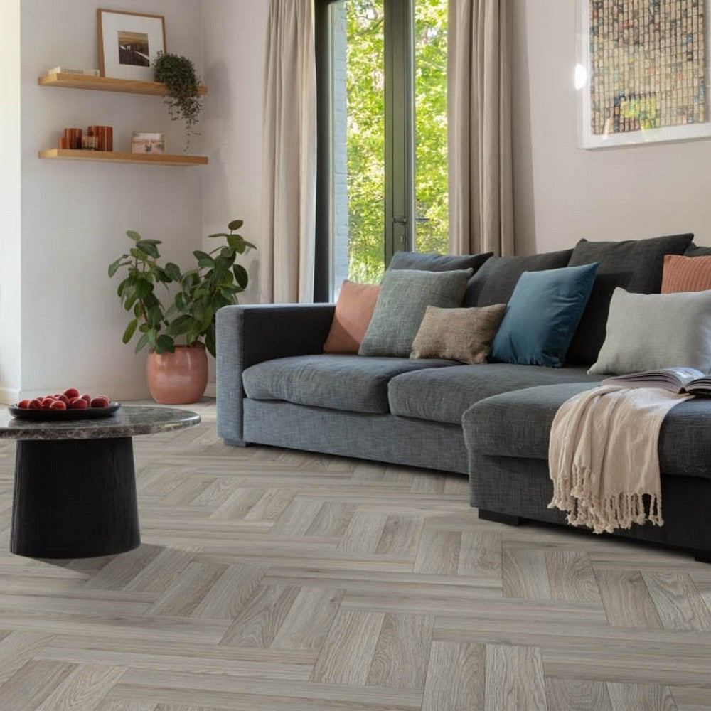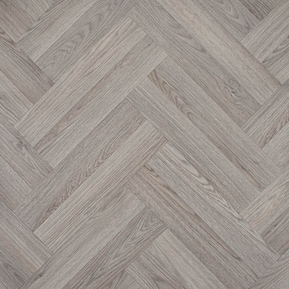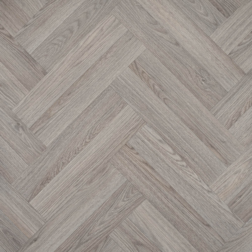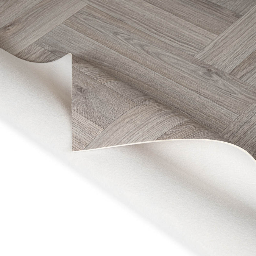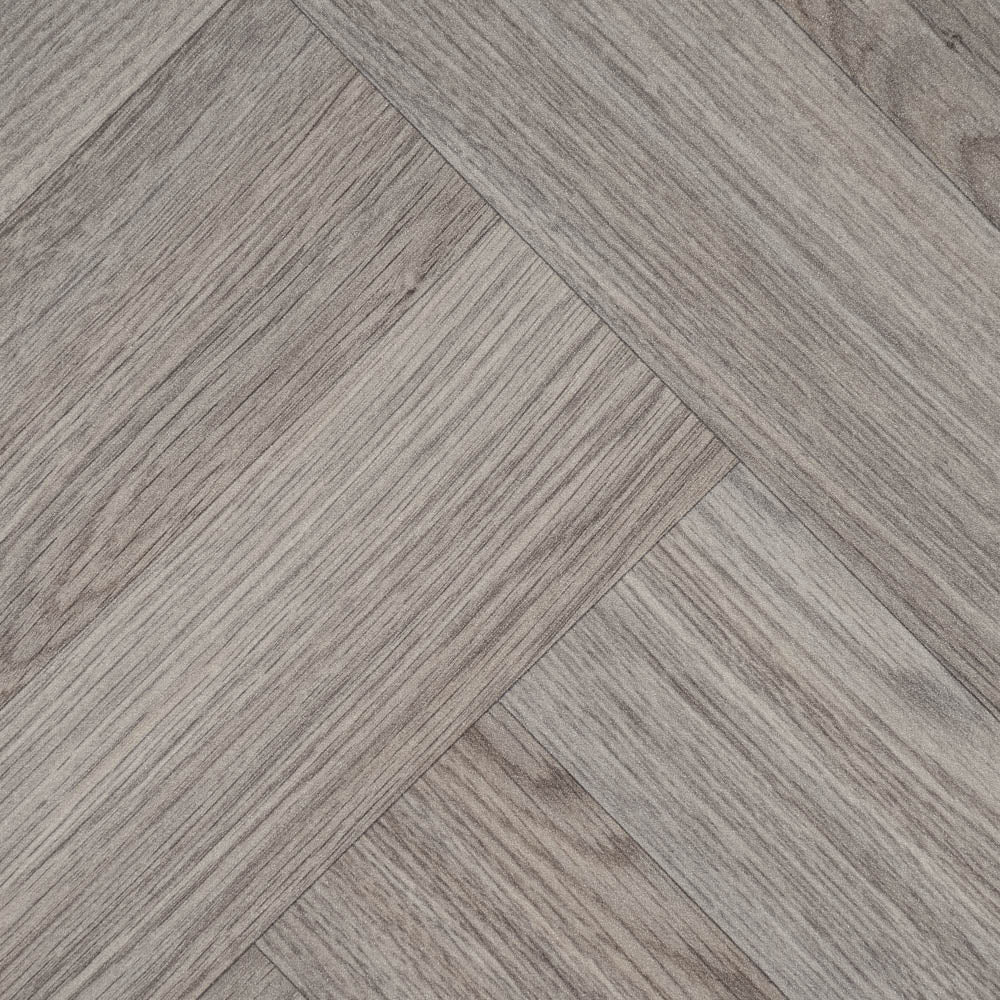 Get a stunning wood look for your room with this vinyl and its double herringbone pattern. The 8.9cm x 47cm plank effect gives the impression of a parquet floor but due to its sheet design it is easier to cut and fit in your home. The light grey colours, detailed grain, lifelike join and matt finish provide this vinyl with an exceptionally natural ambience.