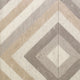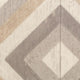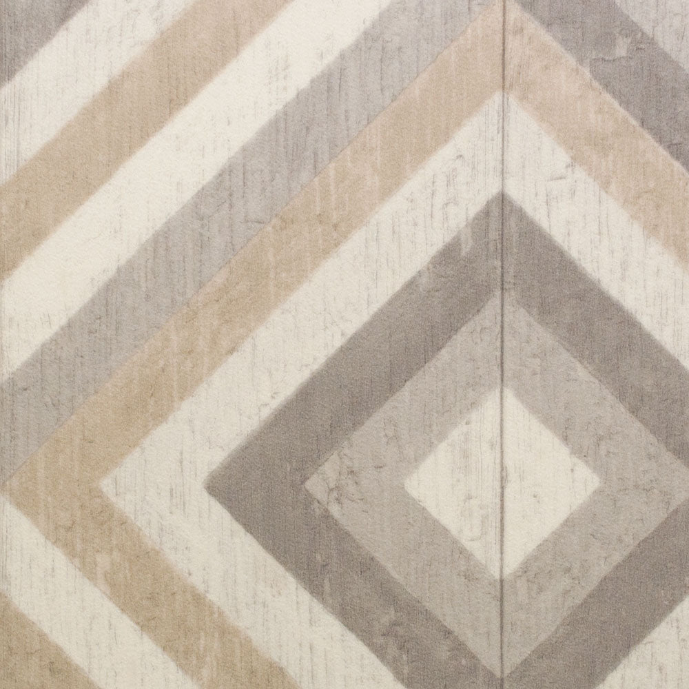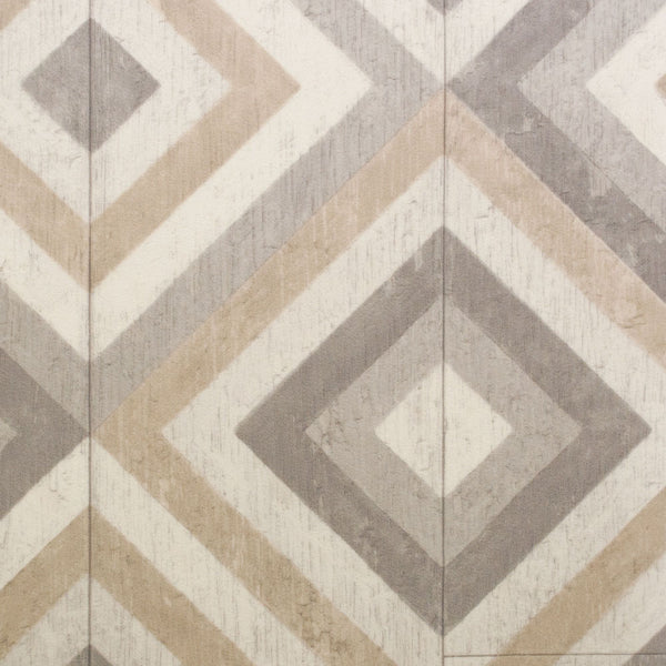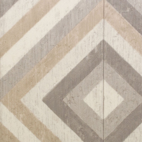This vinyl has a wood effect in four colours with light cream, mid grey, light grey and beige. The four shades create a diamond/chevron pattern that appears to continue across multiple planks. With its modern geometric design and light colours this flooring adds a stylish, fun feel to any room.