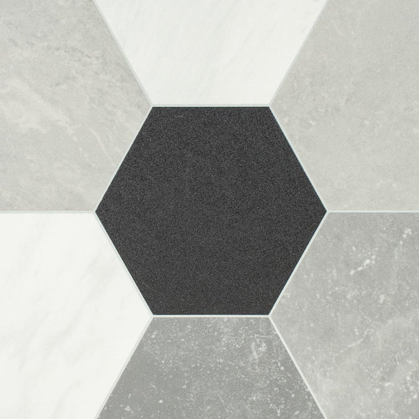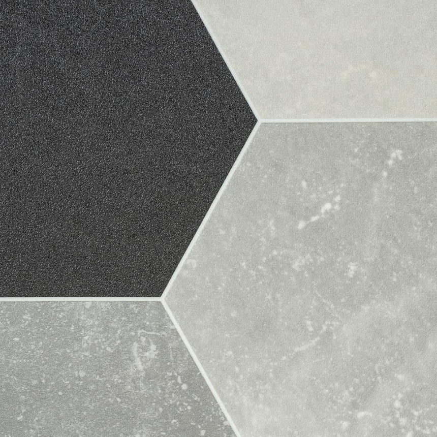 This creative vinyl flooring has a brilliant pattern of stone 19.7cm x 22cm hexagon tiles in various shades from ivory grey to black. With its random looking pattern, realistic stone design and neutral colours, this vinyl flooring is ideal for adding some character into any modern or traditional style room. A matt finish adds further realism to this flooring and with its R10 slip resistance rating, this vinyl is suitable all around the home.