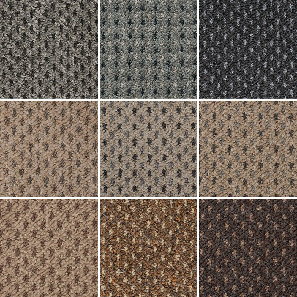 These carpets come in a modern dot pattern with raised and lowered areas for a slightly structured feel. You can choose between multiple core colours with two and three colour designs. The 5mm loop pile is stain resistant and can be cleaned with a dilute bleach solution thanks to its polypropylene fibres.