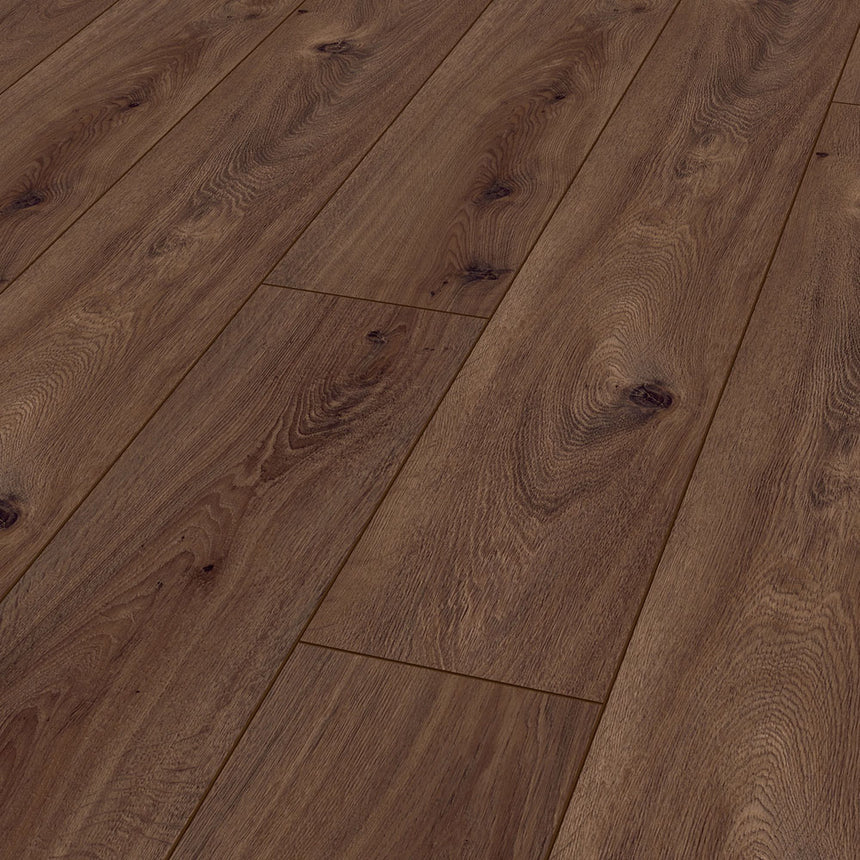 The Prestige Oak Dark Kronotex Exquisit 8mm Laminate has a really rich, almost treacle brown colouring with a natural oak grain design.