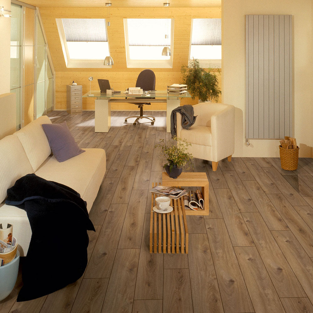 The Prestige Oak Natural Kronotex Exquisit Laminate Flooring has an earthy, realistic oak colouring with a realistic wood grain design.