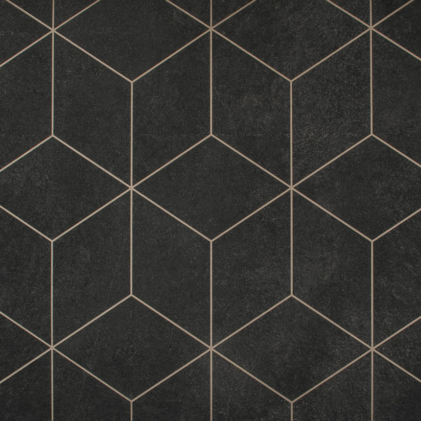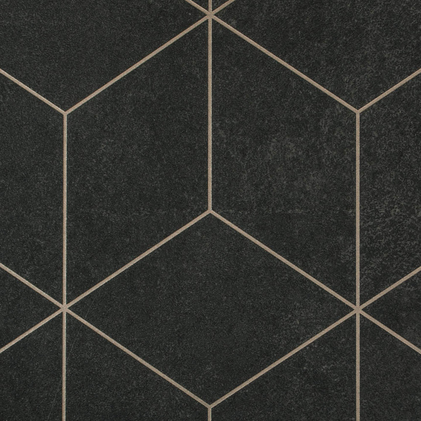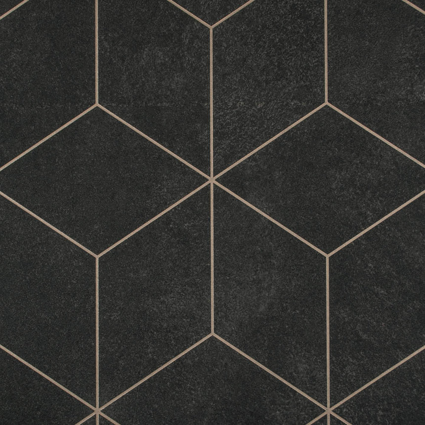 This black vinyl has a realistic stone effect across the 10.8cm x 16.2cm tiles and a rose gold coloured grouting line between them. The contemporary 3D cube design works beautifully with modern rooms and decor and, with its realistic appearance complements traditional styles as well. The matt and embossed surface adds a final true to life look and feel.