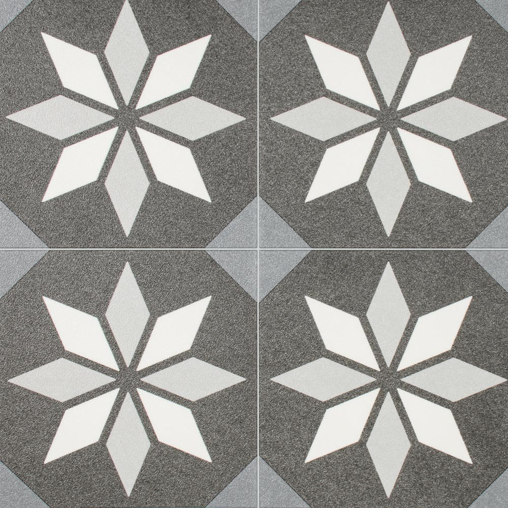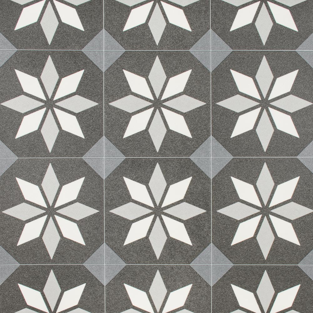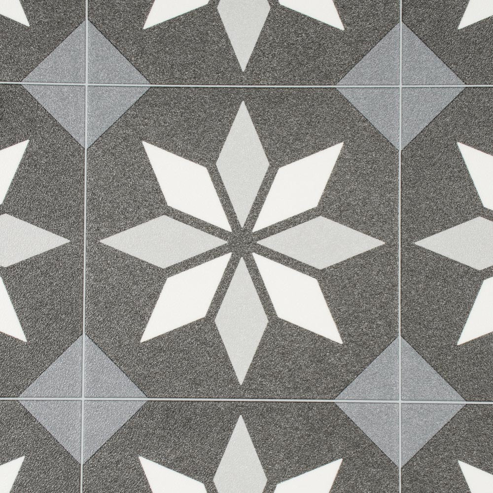 This breathtaking Scottsdale 909D Arizona Tile Vinyl Flooring combines a beautiful design and bold shades of black, light grey and white. Its stunning geometric star pattern gives this vinyl a modern look that also complements traditional styles.