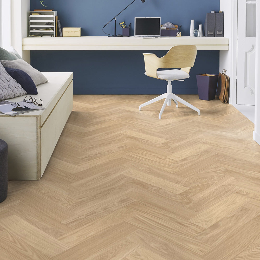 Its warm beige hues create a welcoming atmosphere that complements the vinyl’s classic herringbone pattern. The realistic wood grain and knots design is paired with a matt finish to complete its natural look. Its sheet construction makes it easier to fit this flooring than real wood or laminate flooring