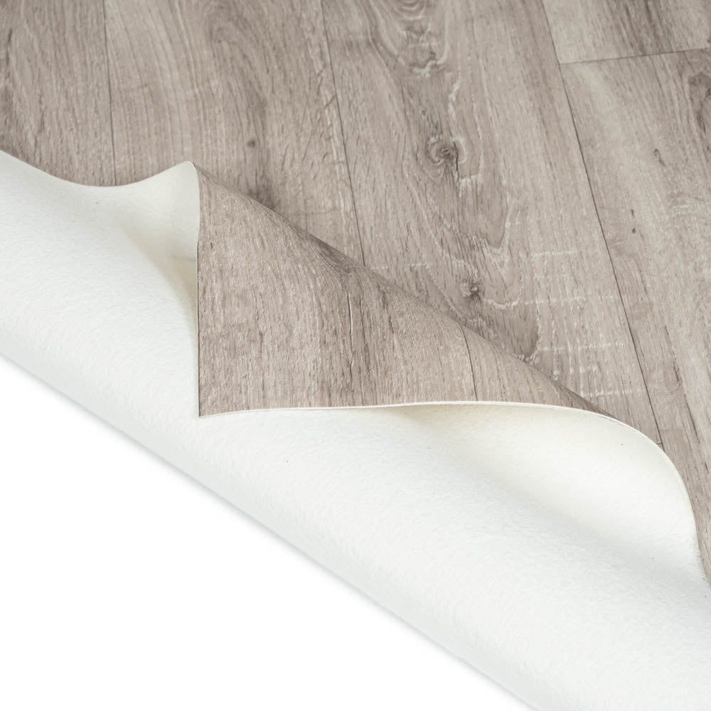 The elegant light grey shades make this vinyl extremely versatile and helps it to complement many different colour schemes and furnishings. The realistic wood design shows 16.6cm x 100cm planks with a distressed effect and a matt finish giving your floor a superb atmosphere.