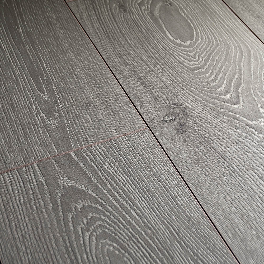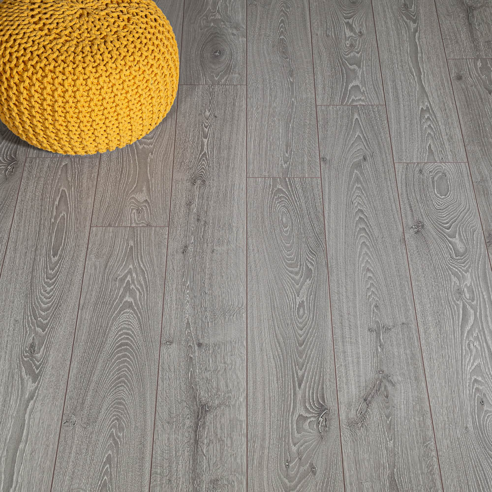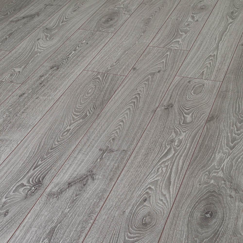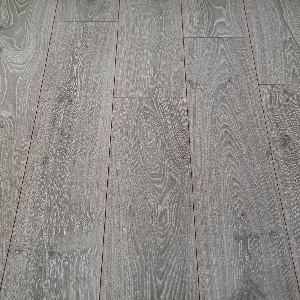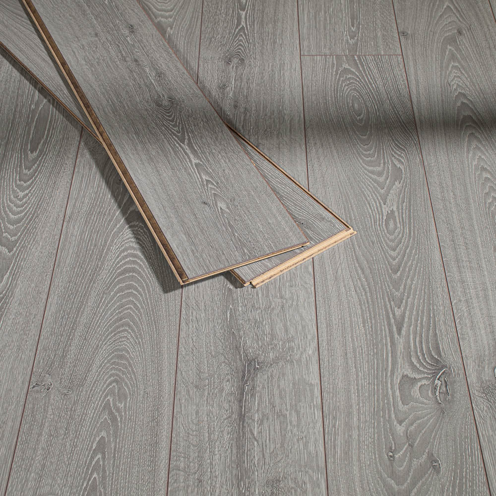 The Timeless Oak Kronotex Robusto Villa 12mm Laminate Flooring has a silvery grey look with a shimmering white and dark grey grain pattern.