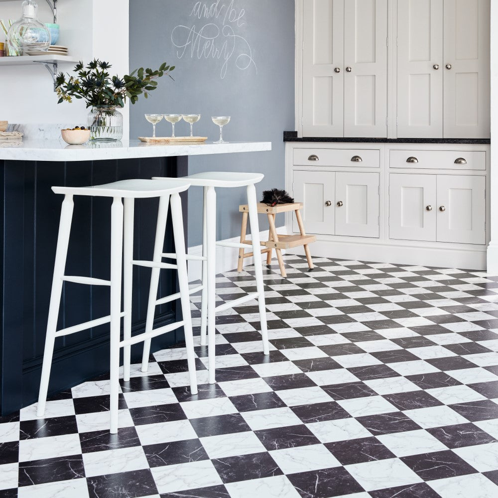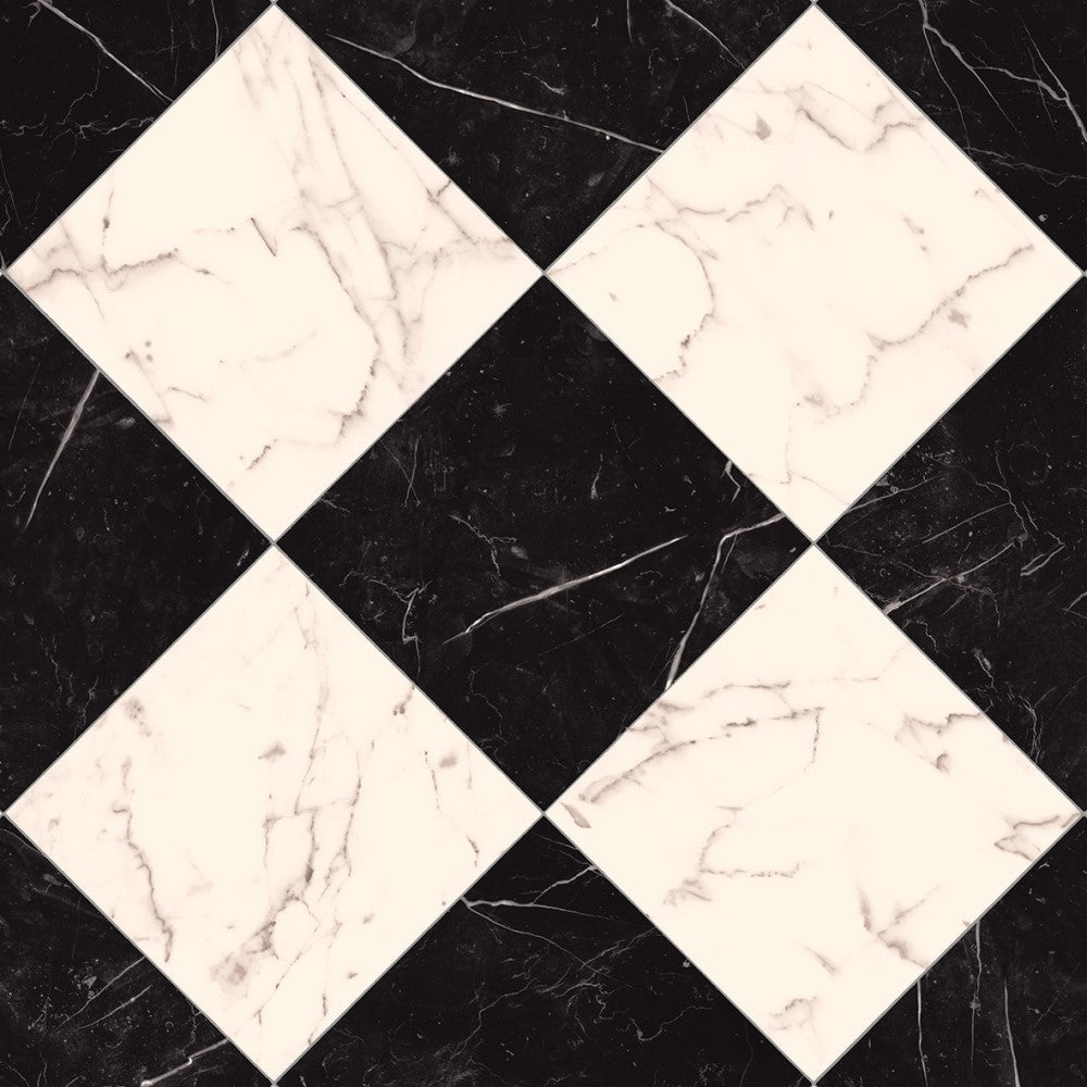 This beautiful marble tile style vinyl has an amazingly realistic look. The 25cm x 25cm diamond tiles alternate between black and white to create a classic chequerboard pattern. With its detailed marble effect, matt finish and embossed surface, this vinyl feels as good as it looks. The sophisticated monochromatic design looks fabulous with almost any colour and decor, from the ultra modern to more traditional styles.